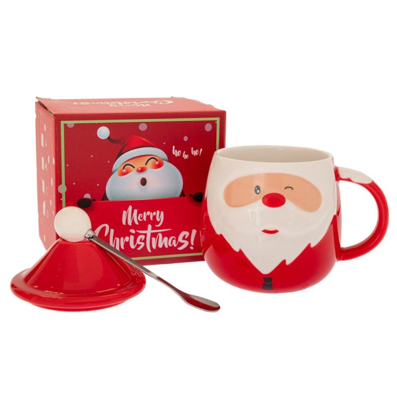 КОЛЕДНА ЧЕРВЕНА КЕРАМИЧНА ЧАША С КАПАК ДЯДО КОЛЕДАВ КУТИЯ
