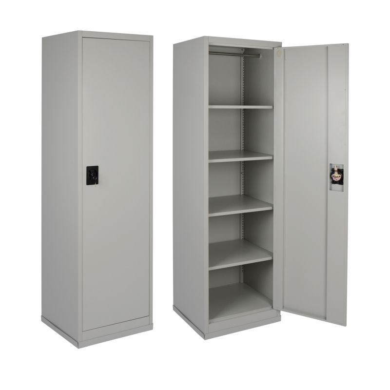 Има една врата и вътре има 4 рафта, които могат да се регулират според вашите нужди. Вратата е с ключалка, която се заключва с ключ, а цветът на гардероба е много светло сив. РАЗМЕРИ: 50x45x185H см. МАТЕРИАЛИ ...