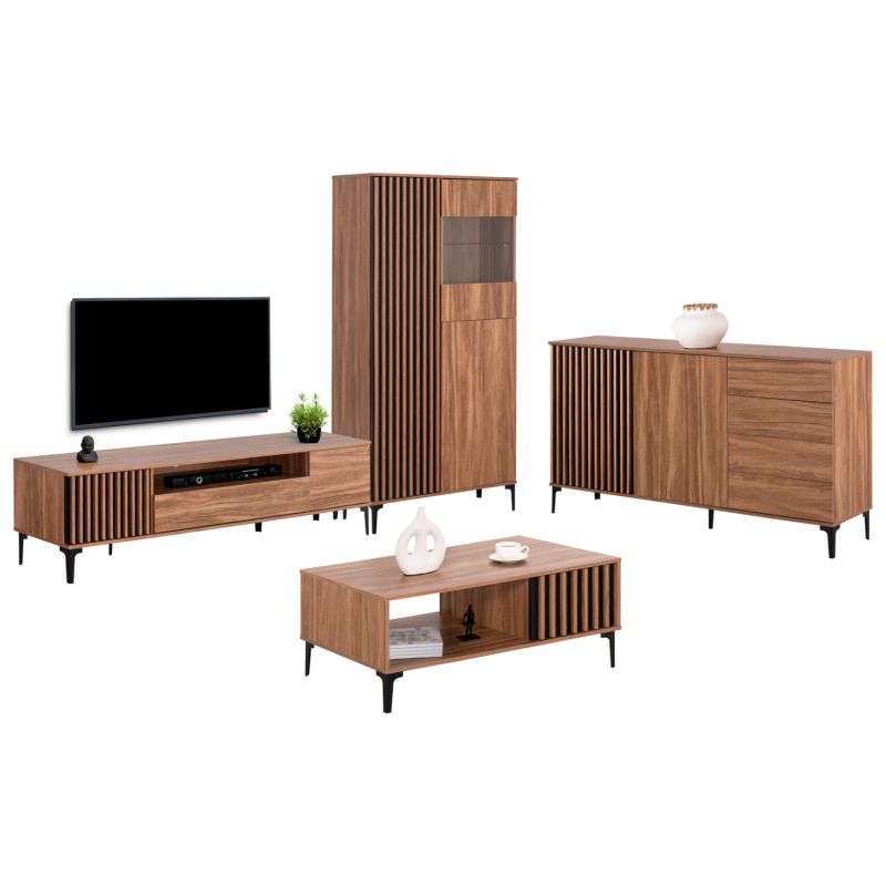 Състои се от подов ТВ шкаф, бюфет, холна маса и витрина с готова инсталация за вътрешно осветление! Цялата композиция е от същата серия, като преобладаващите цветове са НАТУРАЛНО дърво и ЧЕРНО.
