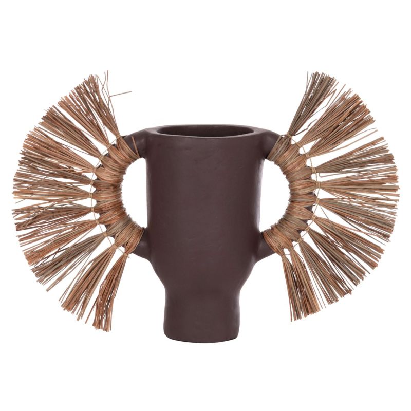 Изработена е изцяло от теракота в цвят ШОКОЛАД, като има две дръжки, покрити със суха трева, и сравнително широко устие.