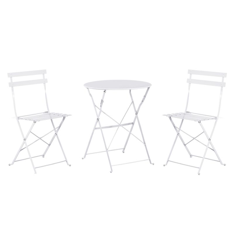Холна маса SOPHIE от 3 части в цвят WHITE се състои от 1 кръгла маса и 2 стола, изцяло метални и сгъваеми.