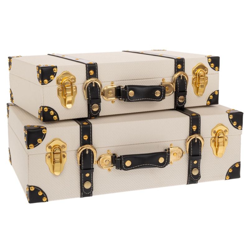 КОМПЛЕКТ ОТ 2 БЕЛИ КУФАРА С ЧЕРНИ КОЖЕНИ ДЕТАЙЛИ 45X15X30СМ 40X10X25СМ