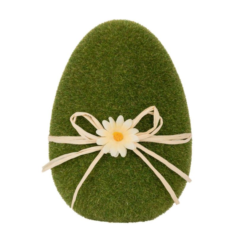 ЗЕЛЕНО ФЛОКИРАНО ЯЙЦЕ С КРАСИВО БЯЛО ЦВЕТЯ И ПАНДЕЛКА ЗА ВЕЛИКДЕНСКА ДЕКОРАЦИЯ 15 СМ
