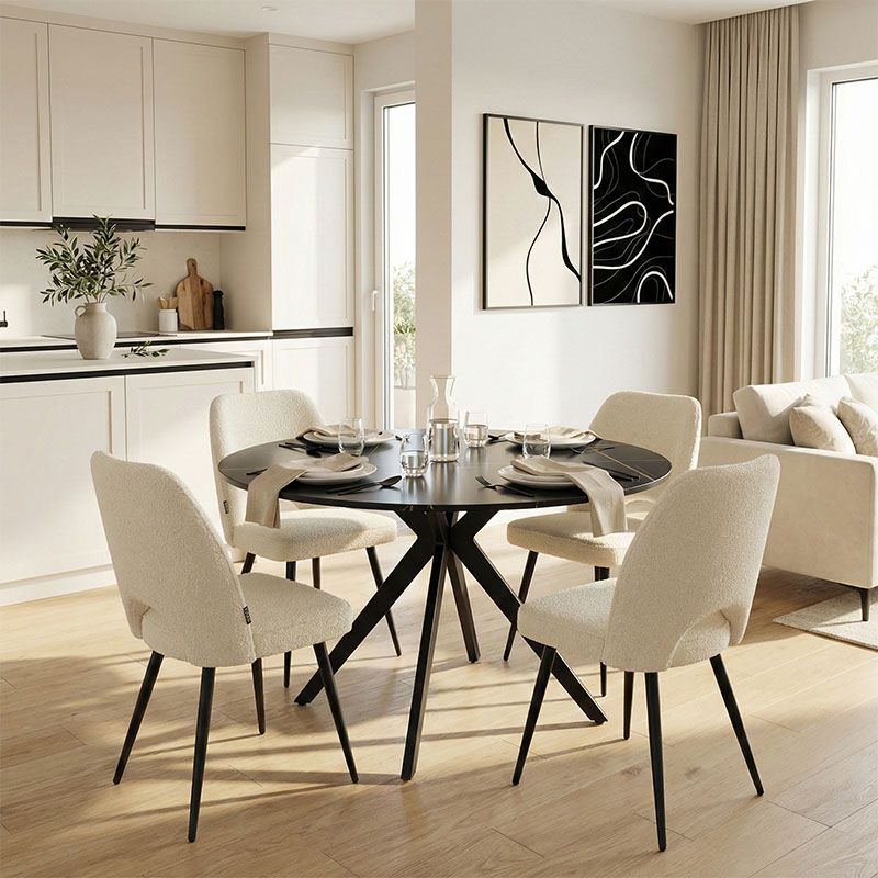 ТРАПЕЗАРИЯ С БЕЛИ СТОЛОВЕ RENISH И ЧЕРНА ОРБИТАЛНА МАСА D120X76 СМ, КОМПЛЕКТ ОТ 5 ЧАСТИ